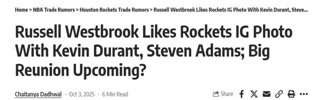 当2025-26赛季NBA常规赛拉开帷幕时,一个罕见的场景出现了:过去17年始终活跃在联盟名单中的拉塞尔·威斯布鲁克,或许将首次缺席了赛季开局。这位曾经的常规赛MVP、连续两个赛季达成场均三双的传奇后卫,在休赛期放弃掘金球员选项后遭遇职业生涯低谷——除国王队表达过微弱兴趣外,其余29支球队均保持沉默。就在威少濒临无球可打的边缘时,露天看台的记者柴坦亚·达德瓦尔爆料,休斯顿火箭或将为威少伸出的橄榄枝,让一场横跨十年的青春重逢有望上演。随着12月交易窗口期临近,这位36岁的老将正无限接近加盟火箭,与前雷霆队友凯文·杜兰特、史蒂文·亚当斯再续前缘。